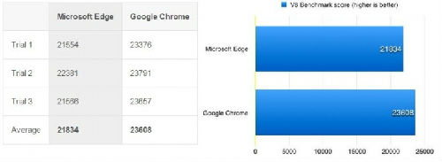 这款JavaScript测试工具是谷歌开发的,本来是为Chrome的JavaScript的性能测试而设计的,所以用它来测试Edge似乎有点不公平,不过既然都支持JavaScript,那也不妨用一用。这里的分数也是越高越好。