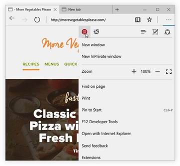 另外,页面还提供了一张截图,展示了Edge浏览器扩展功能的早期效果图。如下图所示,安装后的扩展显示在Hub中心按钮旁边,而Hub中心、Web笔记以及共享按钮被隐藏到了设置菜单中(这与浏览器窗口宽度有关,在目前的版本中窗口尺寸较窄时这些按钮也会在菜单中显示,不过没有图标)。