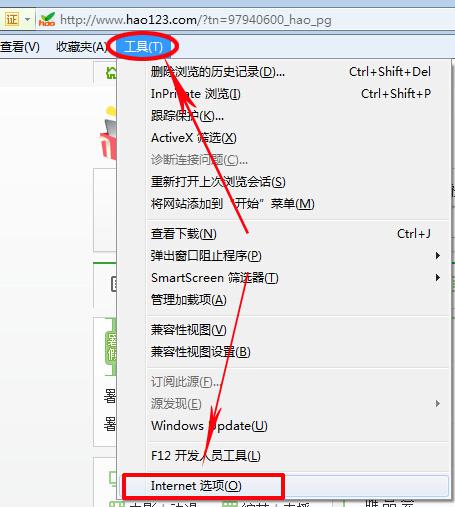 1.在IE浏览器中找到“工具”,找到并点击其中的“Internet选项”。