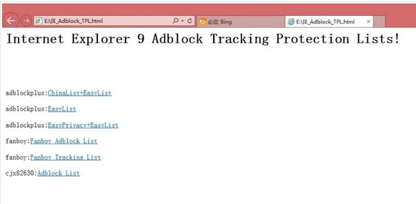 Add TPL: <a href="javascript:window.external.msAddTrackingProtectionList('http://easylist-msie.adblockplus.org/chinalist+easylist.tpl','ChinaList+EasyList')">ChinaList+EasyList</a>