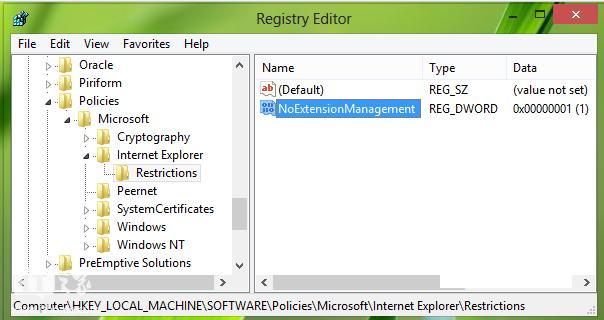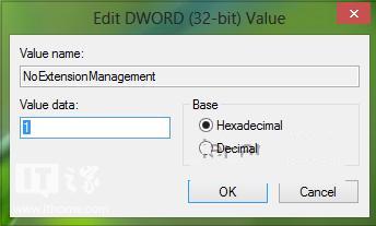 3、接着在上图窗口中的右侧,找到NoExtensionManagement(REG_DWORD)(值应该为1)双击,打开如下窗口;