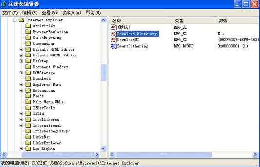 如果是要更改IE浏览器默认下载目录的话,我们可以通过修改注册表的方法实现,打开注册表依次展开:HKEY_CURRENT_USER\Software\Microsoft\Internet Explorer键值,这时候我们就能看见在 Internet Explorer 键值下发现一个为“DownLoad Directory”的字符串值。它就是用于定义IE浏览器默认下载路径的,我们只需要对它进行修改,就能设置IE浏览器的默认下载路径了。下面就让小编来试验一下。