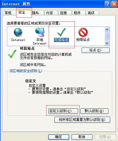 在开始菜单—控制面板里面,打开Internet 选项,然后点击安全选项卡,选择可信站点,再选择自定义级别,如图: