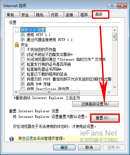 2.在“Internet选项”中点击“高级”,找到“重置”按钮,点击打开。