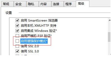 首先,打开Internet选项,进入“高级”选项卡,在“安全”子选项的设置里面,禁用掉“启用增强保护模式”一项(去掉前面的勾),如图。