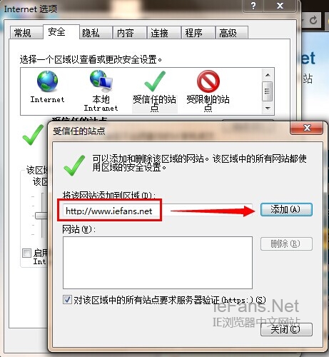 3. 点击“站点”,添加该行的网站。关闭IE,重新登入。