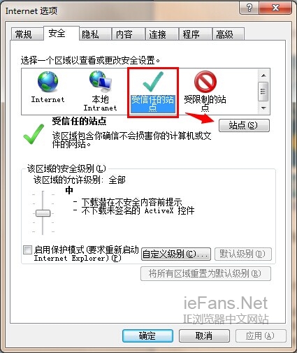 2. 点击界面的上方的“安全”选项卡,然后点击“受信任的站点”