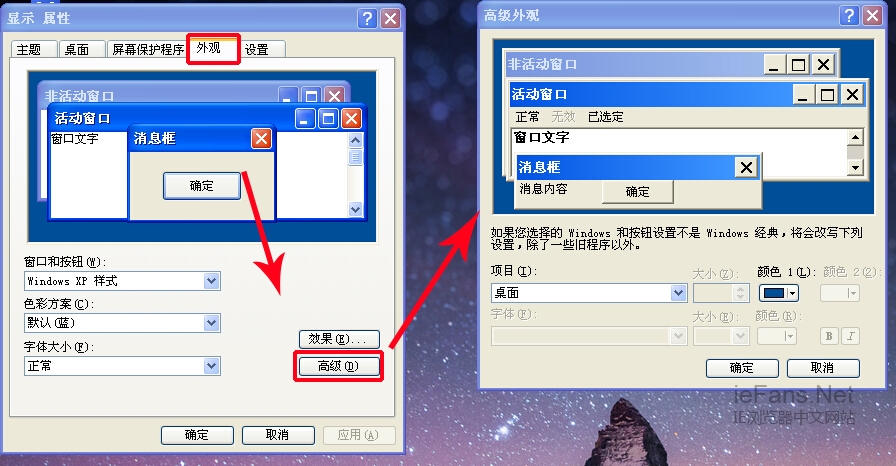 2.弹出以下界面。在上方找到并点击“外观”,出现下图右侧对话框,在对话框右下方找到并点击“高级”,弹出下图右侧对话框。