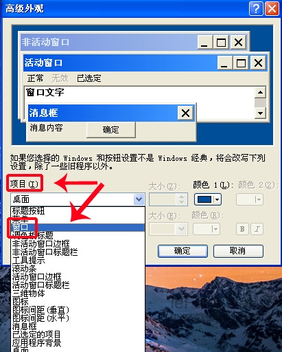 3.在高级外观对话框中找到左下方的“项目”下拉列表,在下来列表中选择“窗口”。接下来开始换色了,我们以淡苹果绿为例。在“选项”右侧的“颜色”下拉列表中,选择“其他”选项。