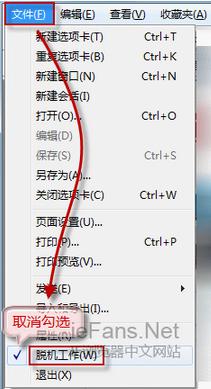 上述标记暗示了IE浏览器正处于脱机工作状态。在菜单栏中。打开“文件”下拉菜单,有个“脱机工作”选项,查看一下,“脱机工作”是否有被勾选,如果有,请取消勾选。如图: