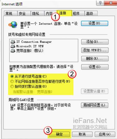 如果不想每次都弹出这个提示窗口,可以这样取消:点击上图“设置”按钮,然后切换到“连接”选项卡,设置为“从不进行拨号连接”,如图: