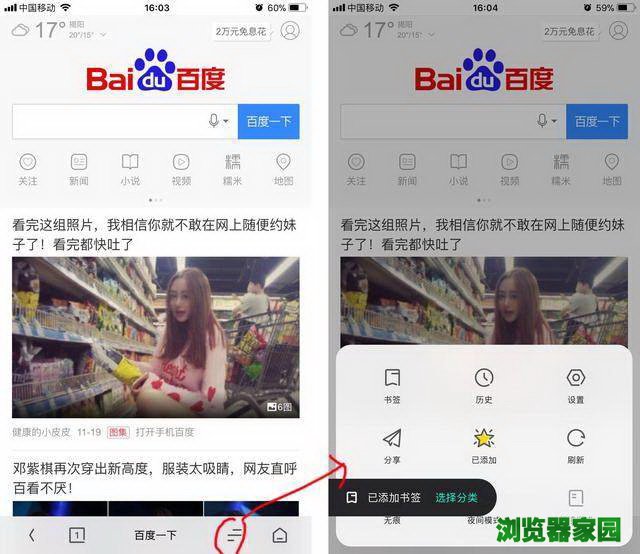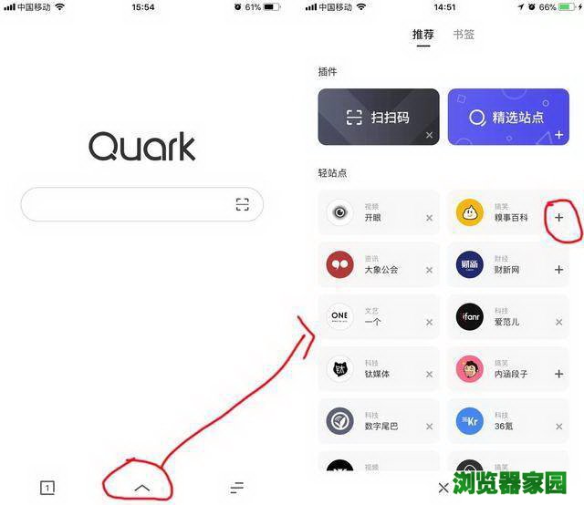 把自己平时访问最多的站点添加到首页的方法也很简单,只需点击底部中间的三角符号,展开一些推荐站点,点击+号即可将站点添加到首页。这里面推荐有很多我们平时访问的内涵段子、糗事百科、one一个等等热门的站点。