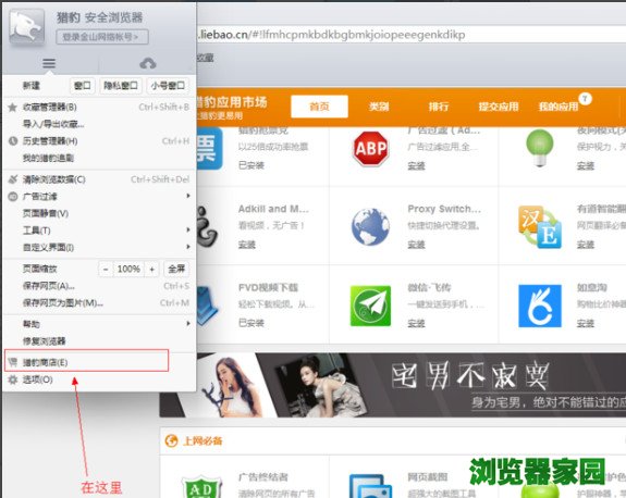 1、首先打开你的猎豹浏览器找到猎豹浏览器左上角的方框(原始的会是一个猎豹的标志),会出现一个下拉框,找到猎豹应用商店
