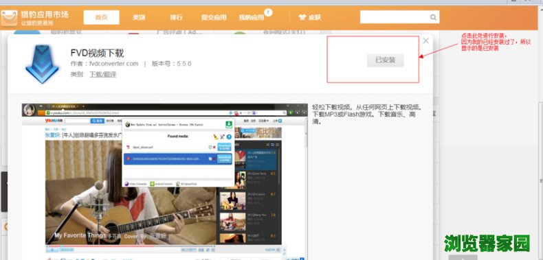 2、进入到猎豹猎豹商店你会看到有很多的应用,找到flv这个应用,点击flv这个应用,点击右上角的安装标志进行安装