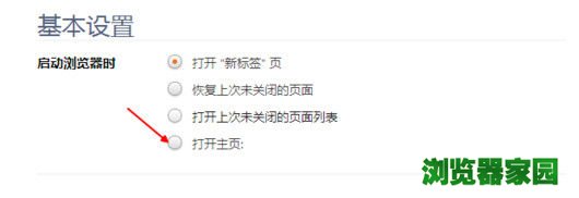 第四步:点击以后,我们就把第一项浏览器打开时后面选择到打开主页这个按钮上。
