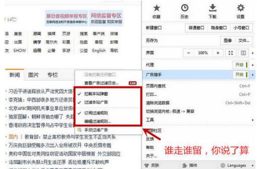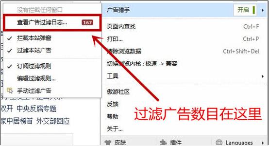 广告猎手会消灭当前网页上所有区域上的各种弹窗、页面广告,还你一个洁净的浏览界面。而在“广告猎手”功能菜单中,你还可以查看广告过滤日志与已经过滤的广告数目,是不是很有成就感?