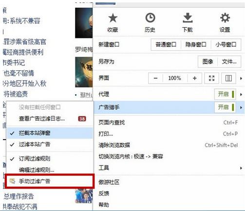 “广告猎手”是傲游云浏览器自带的广告过滤组件。点击浏览器右上角的设置按钮,即可在弹出的菜单中开启“广告猎手”。