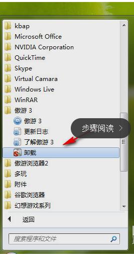 第一种是通过开始菜单项目来卸载。傲游浏览器3.0的开始菜单项在安装的时候会自动生成程序组"开始菜单—所有程序—傲游3",如果你在自定义安装时没有勾选“创建快捷方式—开始菜单”,则不会生成。在程序组中选择“卸载”即可开始卸载 。