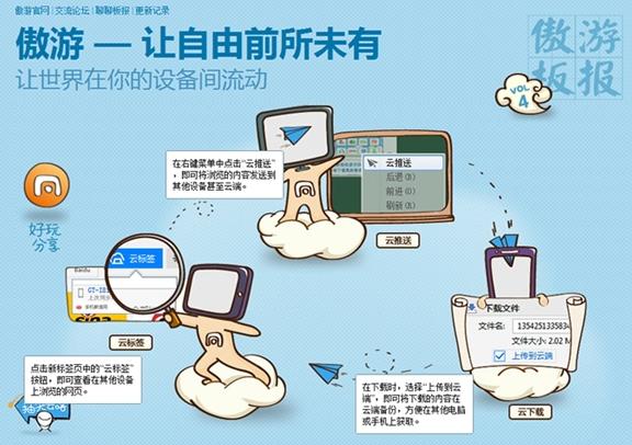 傲游在去年12月首次推出了业界首款依靠云服务,有效地打通多种浏览设备的全新傲游云浏览器预览版,随后在今年1月的版本中加入云分享功能。傲游云浏览器在短短的三个月内,完成了云服务与浏览器间的交互优化,推出了核心产品功能云推送、云标签、云同步、云下载和云分享。