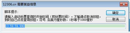 7、输入放票时间前1秒,比如高铁是14点放票,这里输入的是13点59分59秒零990毫秒,这样就能够在最接近放票的时候提交您的订票查询。