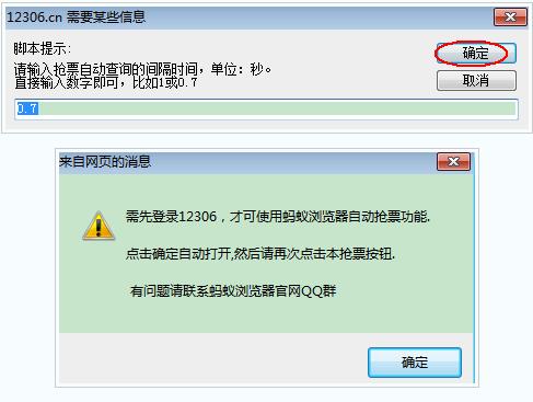 1、安装好蚂蚁浏览器,点击中间上方的按钮“抢票”. 蚂蚁浏览器老用户请从帮助菜单那里升级到最新版,然后点击菜单 工具->修改12306刷票间隔.