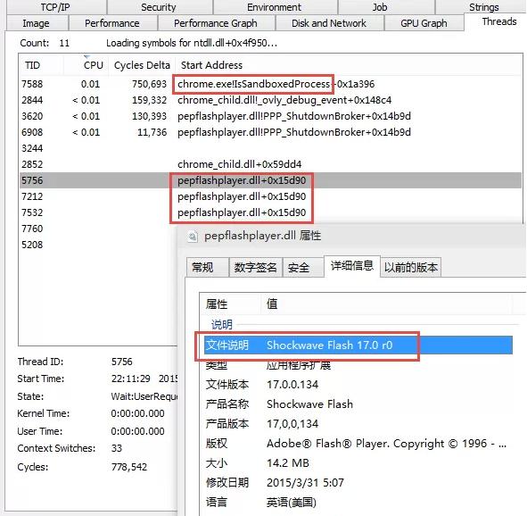 对于Chrome来说,其Flash支持也作为一个独立的沙盒进程来实现,这样安全性更高。由于Chrome的子进程名称完全一样,所以可以从其线程中获知其Flash支持的进程是哪一个。