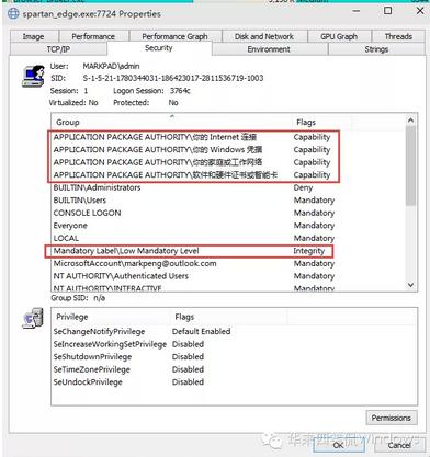 Spartan采用了Windows 10 Metro风格进程的沙盒技术,可以看到其网页进程的完整性级别是Low,表示其采用了Windows保护模式。
