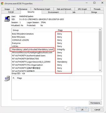 Chrome的沙盒技术利用了Windows自有的安全技术,可以看到其进程的安全级别比Chrome更低,没有任何特权,而且几乎所有的SID都标记为Deny。