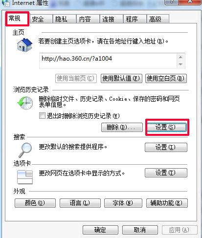 2.在“Internet属性”中的“常规”选项卡中,找到浏览历史记录中的“设置”,点击并打开。