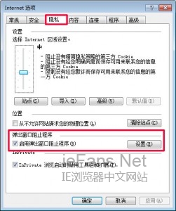 2.在Internet选项中切换到“隐私”,在下面的“启用弹出窗口阻止程序”前选上。