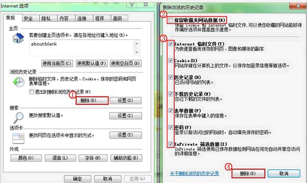 IE8.0 工具——Internet选项——删除——勾选Internet临时文件、cookie(不勾选保留收藏夹网站数据),点击删除