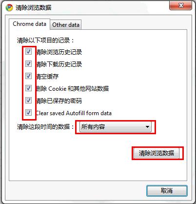 弹出对话框,选择清除内容和时间,单击“清除浏览数据”即可。