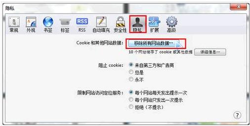 弹出对话框,切换到隐私项,点击“移除所有网站数据”
