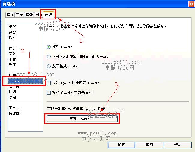 第2步:在打开的Opera浏览器的“首选项”窗口中单击“高级”选项卡,并在高级选项卡中单击左侧中的“Cookie”,然后在单击右侧中的“管理Cookie...”按扭。