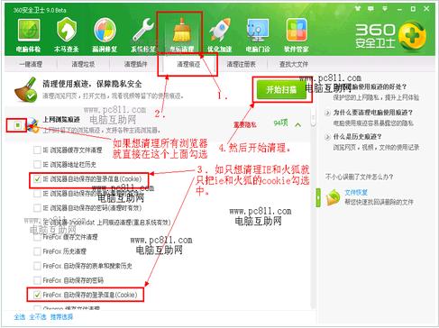 第2步:打开360安全卫士,在360安全卫士中找到并单击“电脑清理”,在电脑清理此项上找到并单击“清理痕迹”选项卡,在“上网浏览痕迹”下依次勾选上需要清理的浏览器。然后单击“开始扫描”按扭。