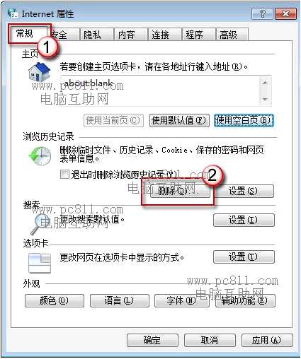 第3步:在“Internet属性”窗口中的“常规”选项卡找到浏览历史记录下的“删除”按扭并单击此按扭。