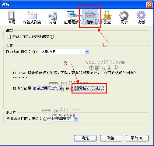 第2步:在打开的火狐浏览器选项窗口中单击“隐私”选项卡,在隐私选项卡中找到并单击“删除私人Cookie”此连接。