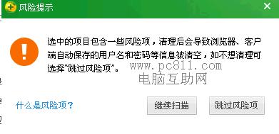第3步:这时360安全卫士有“风险提示”就单击“继续扫描”按扭。