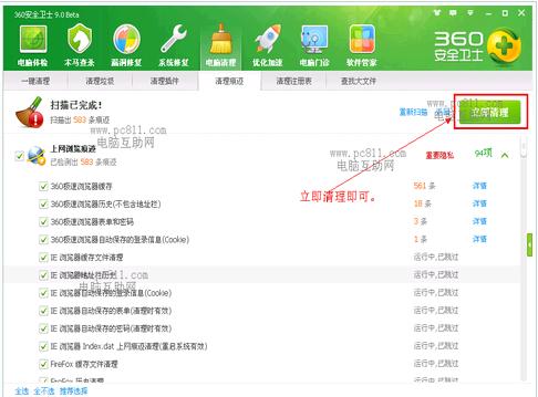 第4步:扫描完成之后,会提示扫描出多少条痕迹,然后单击“立即清理”按扭即可把电脑中所有浏览器中的cookie删除掉。