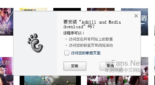 1.这里我们将用到一个小工具(工具仅56KB大小),我们打开浏览器的页面(这里小编使用的猎豹流浪器,IE浏览器好像不行)然后直接将我们这个crx文件拖拽至浏览器中就可以行了。它会出现安装的小界面,点击安装。