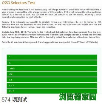 测试方案:CSS的英文全称是Cascading Style Sheets,中文意思是层叠样式表,用来展示网页的显示样式和效果,例如网页采用何种布局、文字采用何字体和颜色、背景选用何种图片和颜色、展示何种网页特效等,因此浏览器对CSS的支持程度决定了能正确显示的网页种类。本轮测试我们使用的是专业测试网站CSS3 Selectors Test,网址http://www.css3.info/selectors-test,它总共有574项测试,主要涉及盒子模型、列表模块、超链接方式、语言模块、背景和边框、文字特效、多栏布局等项目,通过项目越多浏览器支持CSS的性能就越好。