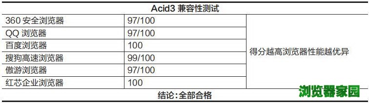 结果分析:测试中出现了意想不到的情况,仅有百度浏览器、红芯企业浏览器获得100分完美通关浏览器兼容性测试,而搜狗高速浏览器得分99,360安全浏览器、傲游浏览器和QQ浏览器得分都是97,难道后四款浏览器的兼容性真的这么差?开启四款浏览器的兼容模式(也就是启用IE内核)后,全部顺利通关兼容性测试。按道理双核浏览器会智能切换内核,不过碰到专业测试网站Acid3出现了意外,我们从网上下载了10年前的建站程序Discuz特制了10个过时网页逐一测试搜狗高速浏览器、360安全浏览器、傲游浏览器和QQ浏览器,浏览器都顺利展示了网页,兼容模式都顺利切换了,也就是说在实际生活中应该不受影响。