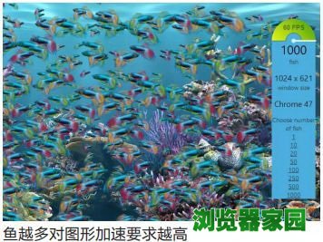 tank,统一设置为1000条彩色鱼在页面乱窜,等10秒数据稳定后观察帧数,帧数越高说明浏览器的图形加速越快性能越好。