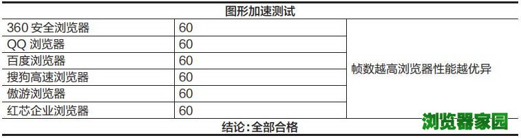 结果分析:6款参测浏览器的帧数全部达到60帧,全部通过图形加速测试。如果使用3年前的浏览器版本,没有一款浏览器的帧数可以超过40帧,有的浏览器甚至会出现极端卡顿的情况,如今这些状况都没有了——虽然帧数值是一样的,但从0~60的过程速度却不一样,明显360安全浏览器和QQ浏览器响应速度更快一些,这是因为360安全浏览器和QQ浏览器使用的都是Chrome 63版的内核,傲游浏览器使用的是Chrome 61版的内核,搜狗高速浏览器使用的是Chrome 58版的内核,红芯企业浏览器使用的是Chrome 49版的内核,百度浏览器使用的是Chrome 47版的内核,如此一来也解释了百度浏览器和红芯企业浏览器在Acid3兼容性上表现优异的原因是因为使用的是低版本的Chrome 内核。