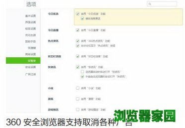 360浏览器在安装时可以选择自定义安装,就可以取消默认设置的首页360导航,打开一个新标签自动展示的是360搜索页面,可以直接搜索相关内容,会弹出购物广告和热点资讯,热点资讯会针对用户所在城市进行有针对性的智能推荐,如果不喜欢这些怎么办?好在360浏览器允许用户进入浏览器设置页面,取消“今日优选”“今日直播”“360热点资讯”“快资讯”“状态栏消息”等,如果再取消侧边栏、状态栏、插件栏和显示头像登录框整个页面就清爽了。