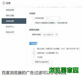 百度浏览器的极光色皮肤是真的炫;默认首页是hao123导航,打开一个新标签自动展示的百度搜索,在收藏夹中自动添加购物、视频等网页;广告过滤不需要安装插件,是标配功能,不过默认是“轻度拦截”需要手动调整为“强力拦截”。