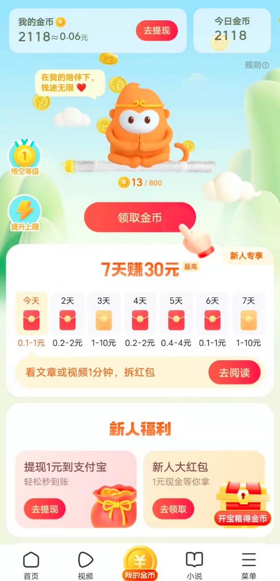 最后一个功能是赚现金,该功能是悟空浏览器的核心功能。用户可以通过刷视频或者看文章获得金币,金币达到一定的额度后可进行支付宝提现。随着用户登录天数的增加,悟空等级也会增加,随之金币存储上限也会提升。