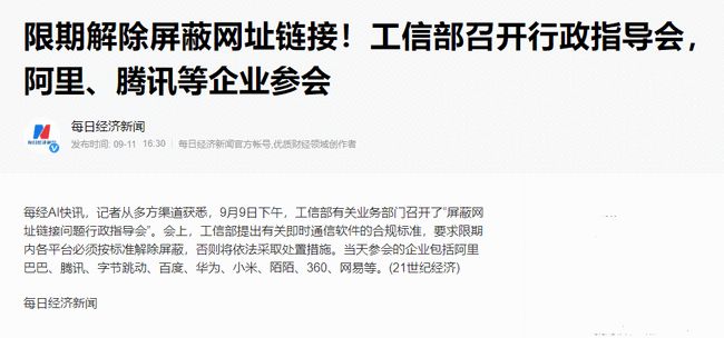 不过就在近日,工信部有关业务部门召开“屏蔽网址链接问题行政指导会”。会上,工信部提出有关即时通信软件的合规标准,要求9月17日之前各平台必须按标准解除屏蔽,否则将依法采取处置措施。