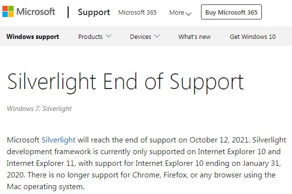 在 2021 年 10 月 12 日之后,所有 Silverlight 客户都将无法获得延长支持 —— 即使你愿意为此付费。Silverlight 的门户网站仍可继续访问,但程序的安装链接将被撤下。