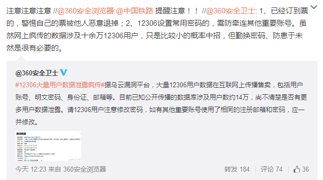 正值春运售票高峰,12306用户量巨大又是100%实名认证,这种程度的信息泄露会造成的影响可想而知,有消息称目前已知的泄露量已经超过了13万条,这么多的12306用户数据在互联网上传播售卖,包括用户账号、明文密码、身份证、邮箱等。目前尚不清楚是否有更多用户数据泄露,相关数据仍在传播售卖。